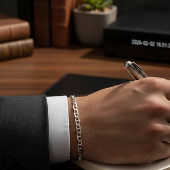Descrição: A união perfeita entre delicadeza e resistência. Com elos de 8 mm de comprimento e uma espessura precisa de 3 mm, esta pulseira em Prata 925 oferece um visual sofisticado e discreto. Seus 20 cm de comprimento proporcionam o caimento ideal para quem prefere joias que acompanham o movimento do pulso com elegância. Uma peça indispensável para o homem de negócios ou para ocasiões que pedem um toque de classe sutil.