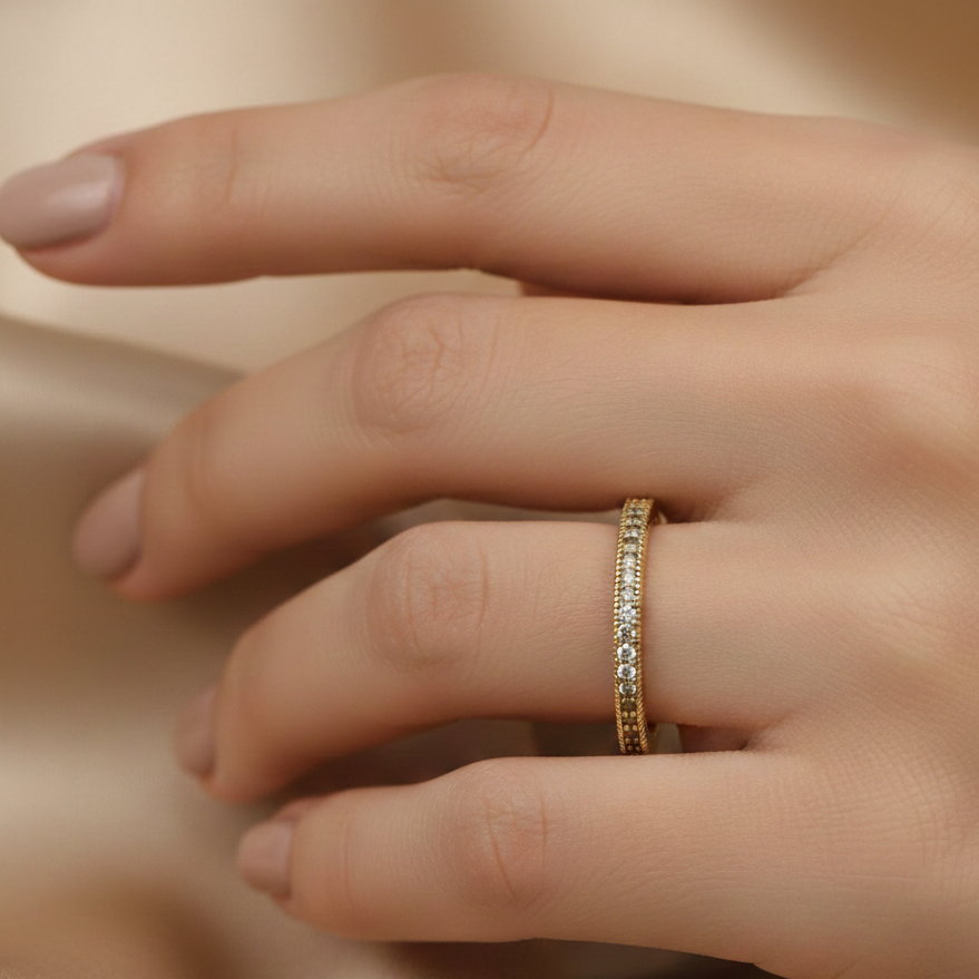 Este modelo é o "coringa" da joalheria. Use-o para renovar o visual da sua aliança de casamento ou crie um stack (combinação) com dois exemplares — um acima e outro abaixo de um anel central — para um efeito de luxo absoluto.
